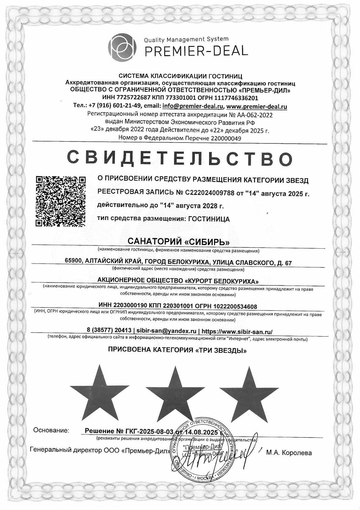 Главный врач санатория «Белокуриха», врач-кардиолог высшей категории, врач-терапевт высшей категории.