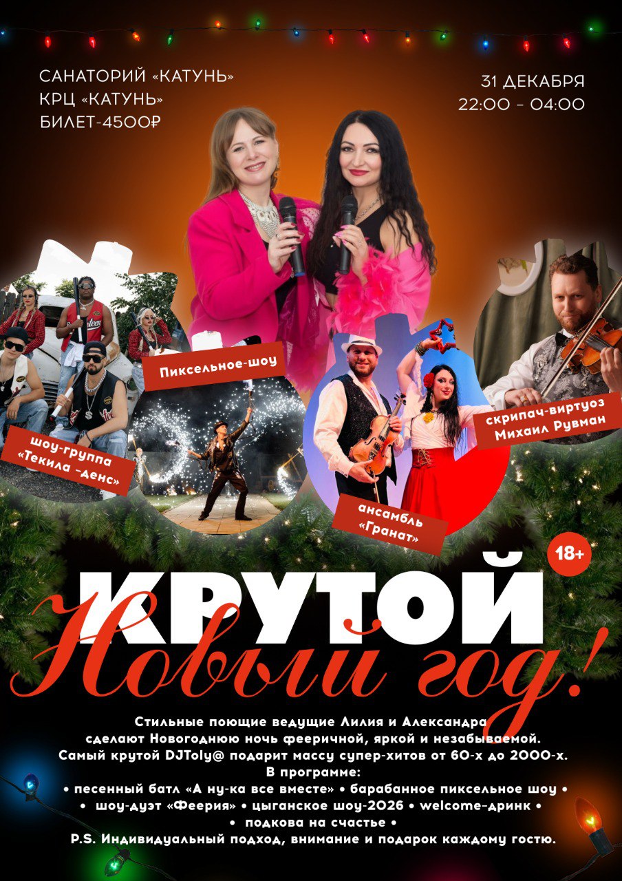 Новогодняя программа здравницы для всей семьи. Гостей ждут не только танцы и песни, но еще и квиз, акробатическое шоу, скрипач-виртуоз, интерактивная программа и другие сюрпризы от организаторов. А дополнят праздник Дед Мороз и Снегурочка с выступлением и поздравлениями.