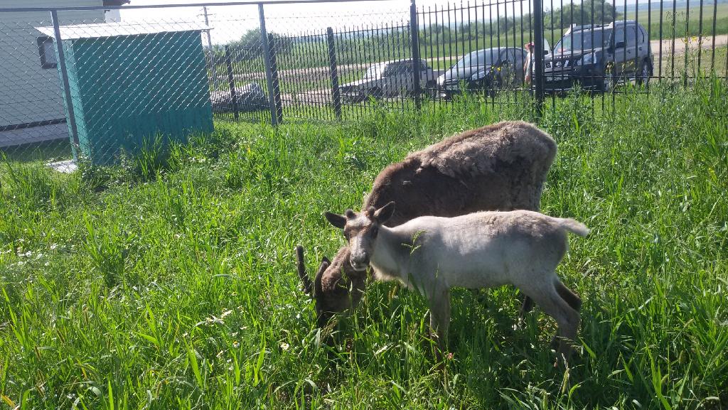 Рядом с «Сибирским подворьем» находится «Парк животных ледникового периода», в зоопарке которого детенышей не меньше. Вот мои любимые северные олени, семейство которых недавно пополнилось малышкой Маей. Счастливая семья на пикнике: