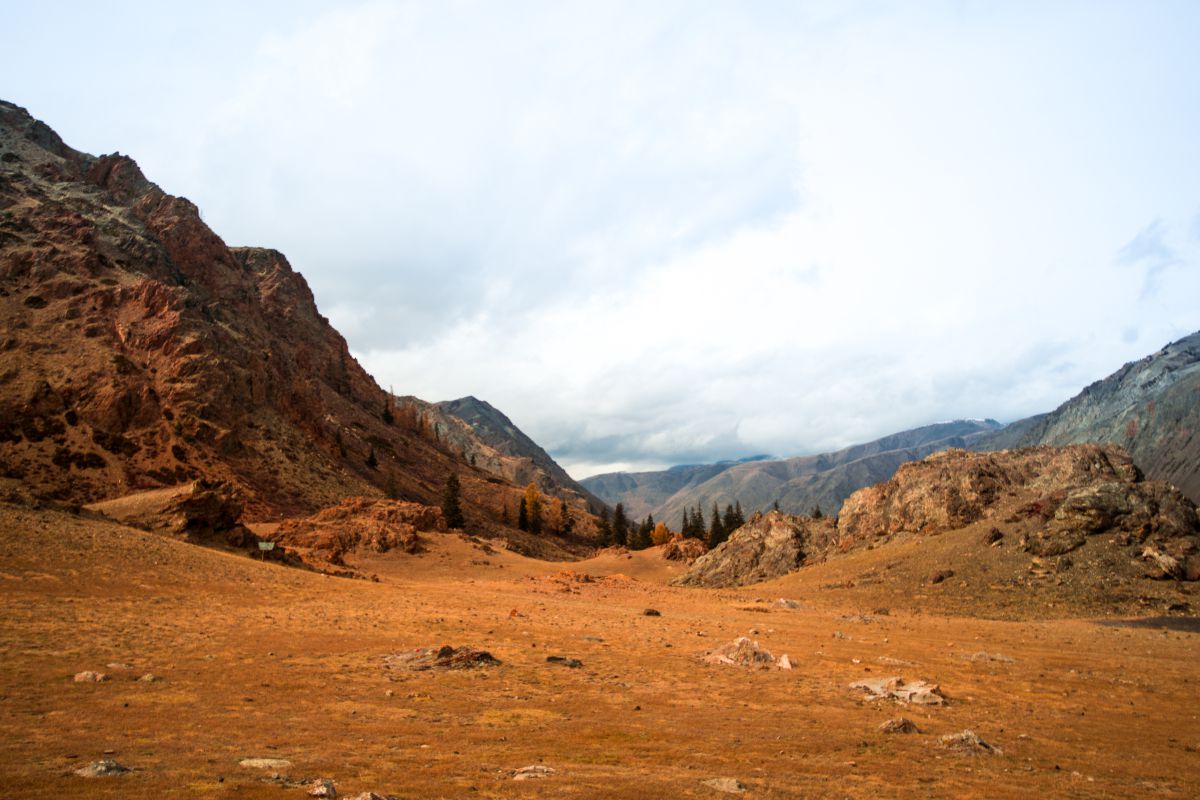 Нам сообщили, что сначала мы отправимся в красное ущелье. По дороге мы наблюдали белые шапки массивного Северо-Чуйского хребта по правой стороне, вдоль которого протекает Чуя, и горы Курайского хребта — слева.
