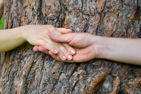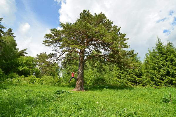 Со стороны дерево кажется не очень большим, но обхватить ствол двумя руками не получится! Скажу сразу, не получилось это сделать даже вдвоем. Мой спутник рискнул показать вот такой акробатический номер, чтобы было видно соотношение размеров человека с сосной.