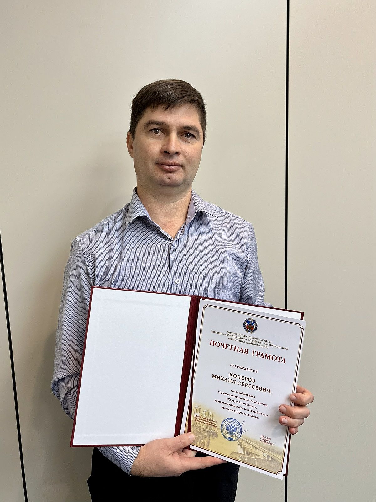 Главному инженеру АО «Курорт Белокуриха» вручили почетную грамоту краевого Минстроя ../../../glavnomu-inzheneru-ao-kurort-belokuriha-vruchili-pochetnuyu-gramotu-kraevogo-minstroya/ Wed, 24 Dec 2025 06:33:58 +0000 ../../../?p=17596 Михаил Сергеевич Кочеров работает в АО «Курорт Белокуриха» 13 лет. В строительстве он уже 21 год. «Я родился и вырос в Белокурихе. Наблюдал, как застраивался курорт, на моих глазах «росли» девятиэтажные дома. И вот тогда я и понял, что буду строителем. Уехал после школы учиться, после пятилетнего обучения в Мордовском государственном университете вернулся на малую […]