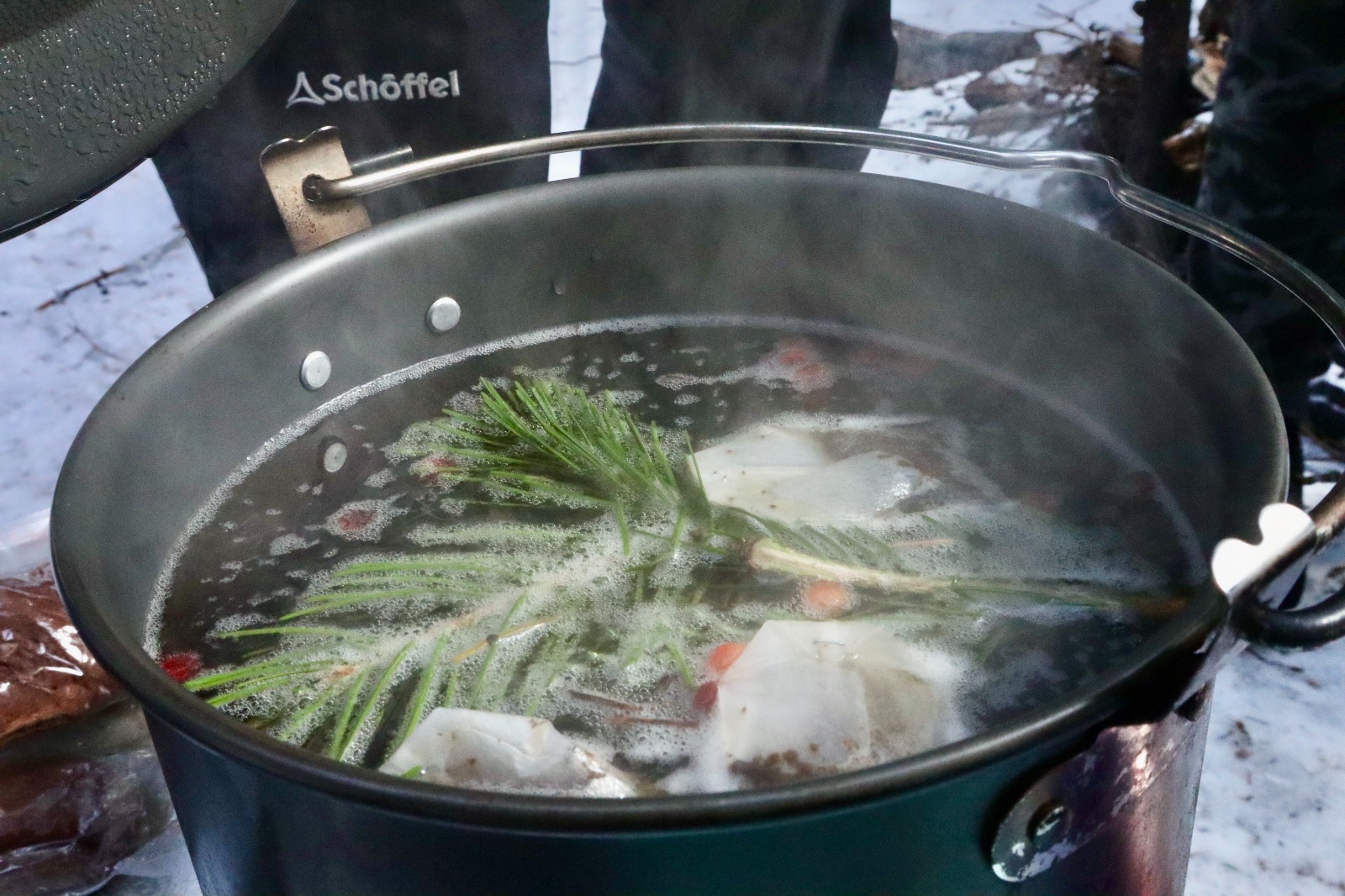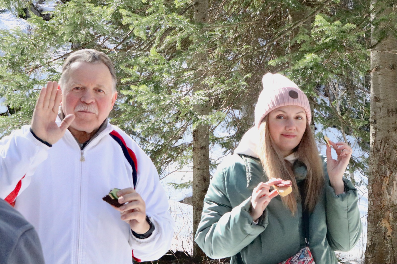 Спустя еще полчаса мы остановились на пикник. Сварили чай из снега и пихтовых веточек. После такого напитка мы отлично согрелись и получили наслаждения от аромата. На нашей скатерти самобранке были продукты собственного производства АО СХП «Алтайские луга»: колбаса, сало, сыр, хлеб, печенье. Кстати, приобрести продукцию может каждый гость и житель Белокурихе. Холдинг «Курорт Белокуриха» запустил стол заказов. В этом выпуске на последней странице вы найдете перечень продукции и цены.