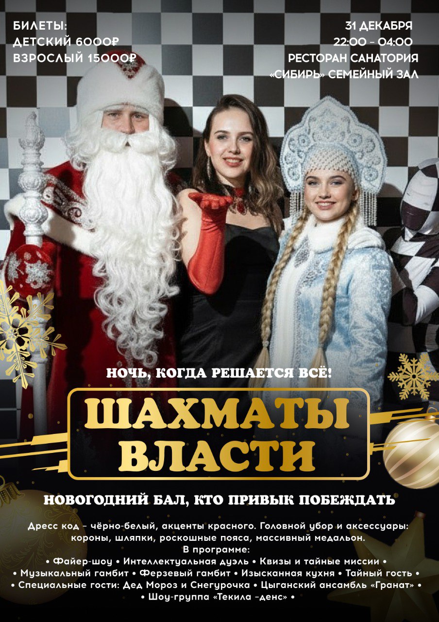 Праздничная программа в шахматной тематике, где не только стилистика, но и развлечения основаны на шахматах. Так, например, гости смогут принять участие в музыкальном и ферзевом гамбитах. Кроме этого, в программе запланированы выступления шоу-группы, файер-шоу и цыганского ансамбля, интеллектуальная игра и квиз. А самыми ожидаемыми гостями программы станут, конечно же, Дед Мороз и Снегурочка.