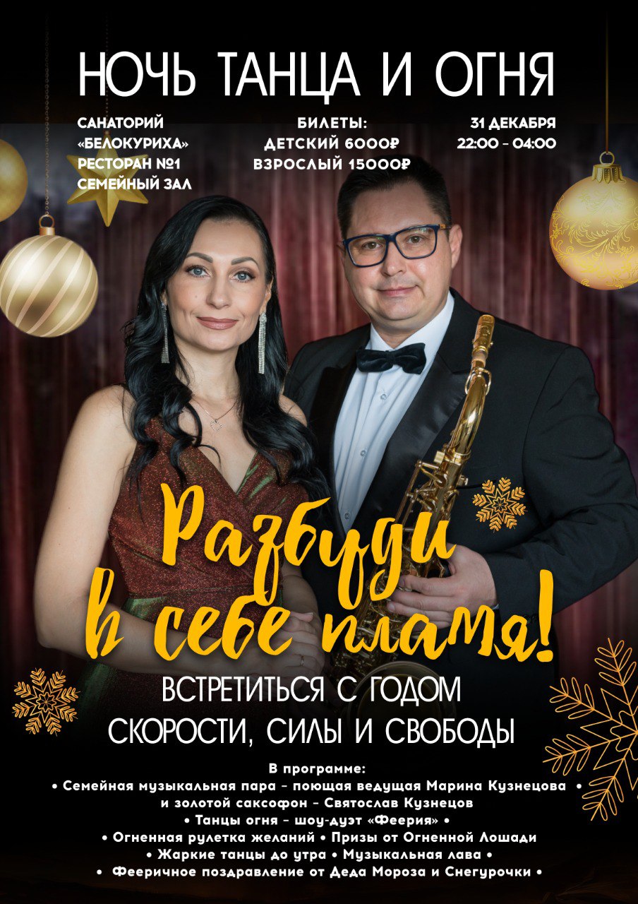 Эта программа подойдет для семейного празднования. Мероприятие будет наполнено танцами от шоу-дуэта и вокалом от ведущей, звуками саксофона и яркими конкурсами в тематике главного символа наступающего года – Красной Огненной Лошади. И, конечно же, как без поздравления Деда Мороза и Снегурочки. Этих персонажей ждут как дети, так и взрослые.