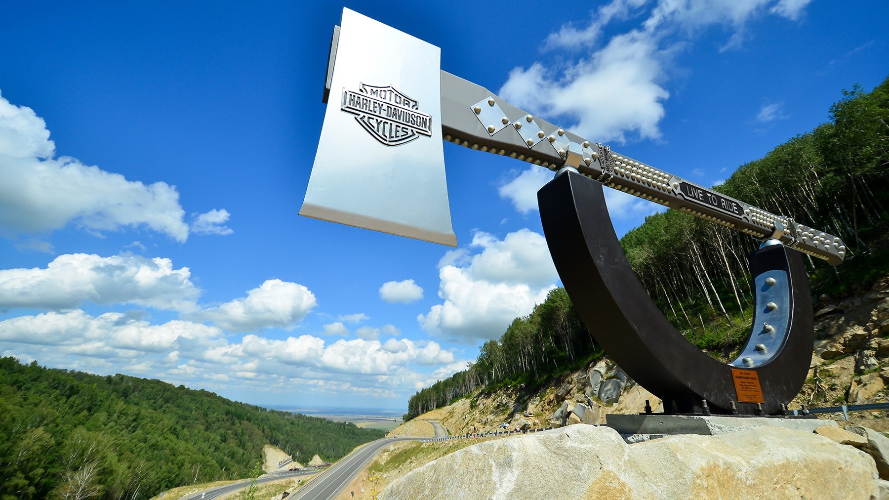 Шестиметровый топор – копия экспоната «Байкер как икона» (В.Войчишин). Данная композиция тесно связана с современностью и её новой субкультурой – любителями и поклонниками мототранспорта. Идея данной работы появилась благодаря клипу Пола Маккартни «Biker Like an Icon», который посвящен байкерам. На топоре разместились все байкерские эмблемы и девиз — «Жизнь ради дороги и дорога ради жизни». Символично, что работа установлена на одной из площадок белокурихинского серпантина – дороги, уже ставшей местом поклонения байкеров и скейтбордистов.