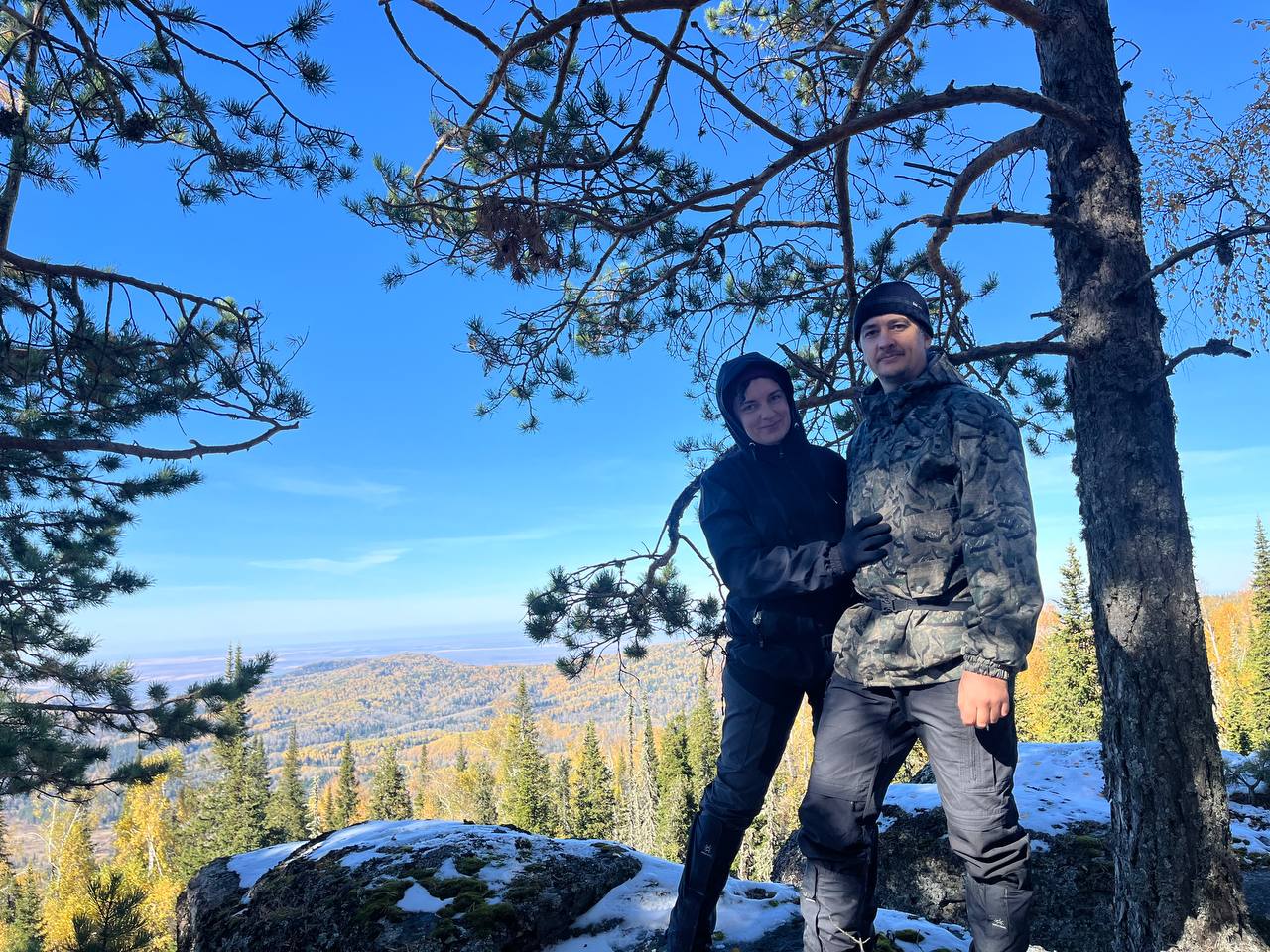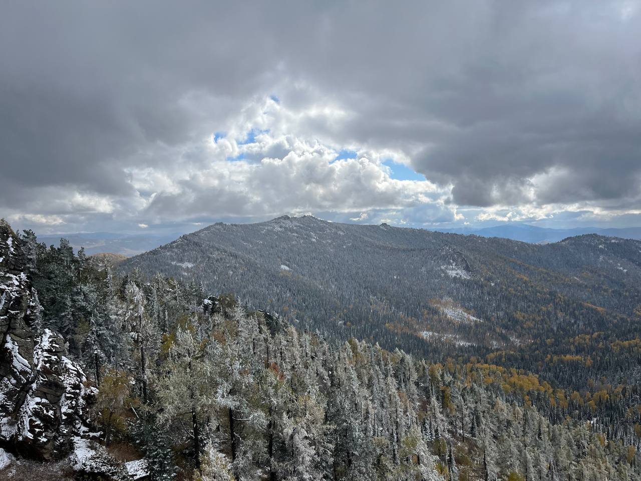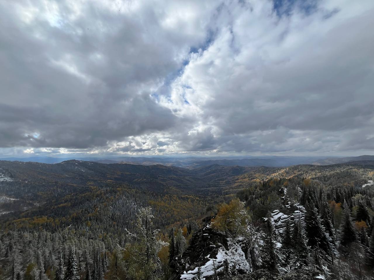 Стартанули мы от управления «Курорт Белокуриха». До первой точки проехали чуть больше 20 км. Там сделали «небольшую разминку» — поднялись на гору «Сухая Грива» — размяться и осмотреться. В День туризма, 27 сентября шел снег. Он образовал белую пелену, из-за которой не видно было ничего дальше нескольких десятков метров. До обзорной площадки на вершине мы прошли около 200 метров.