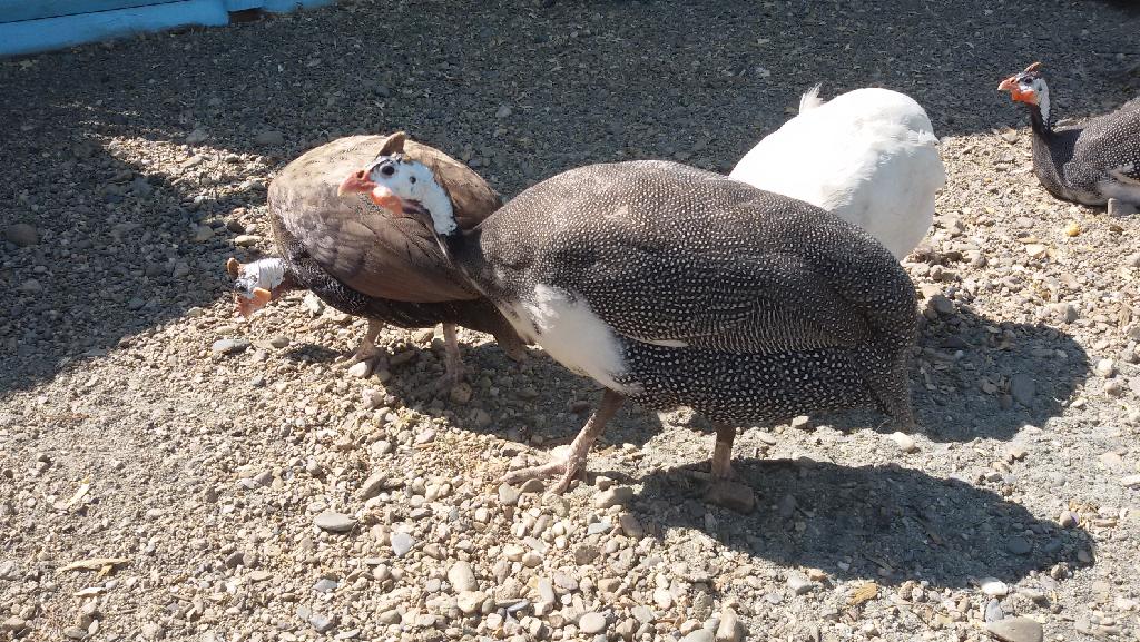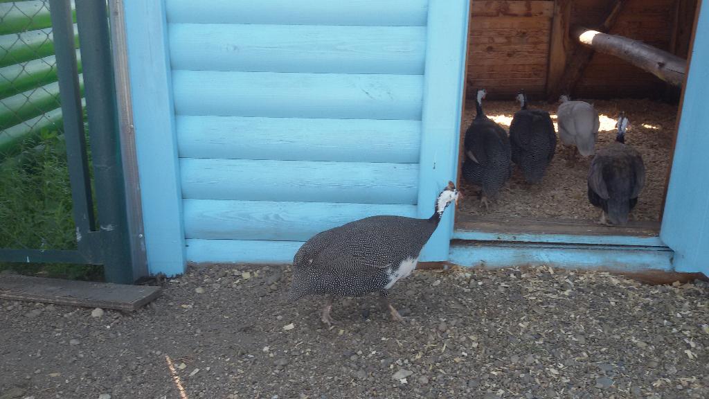 Еще одни новые обитатели «Сибирского подворья» — цесарки, — еще не привыкли к людям, поэтому прячутся от меня в своем новом красивом домике.