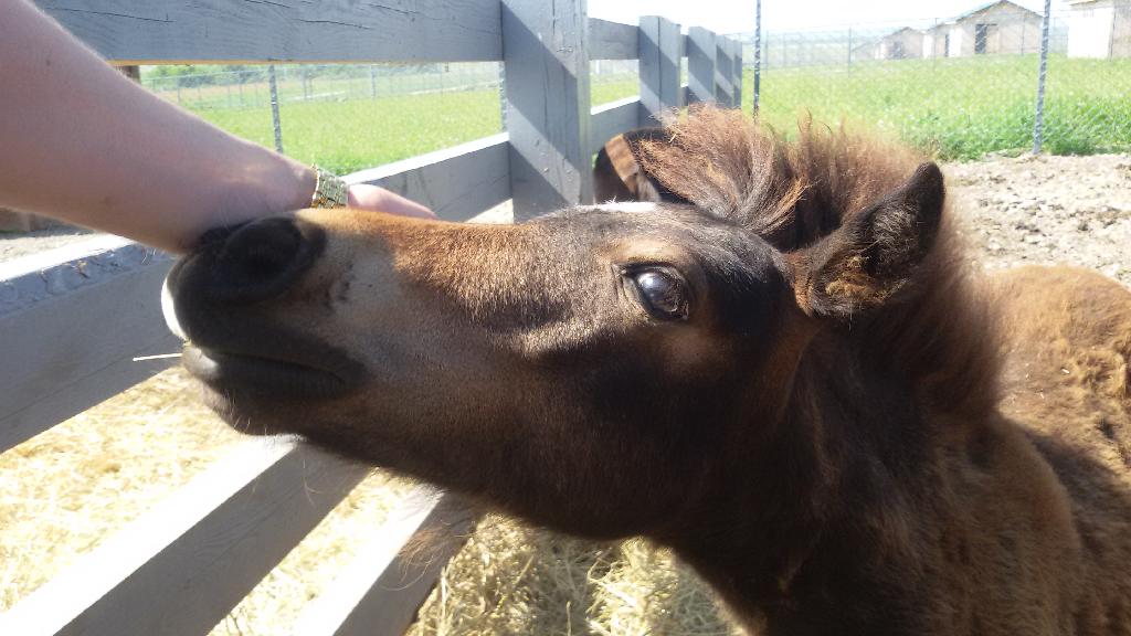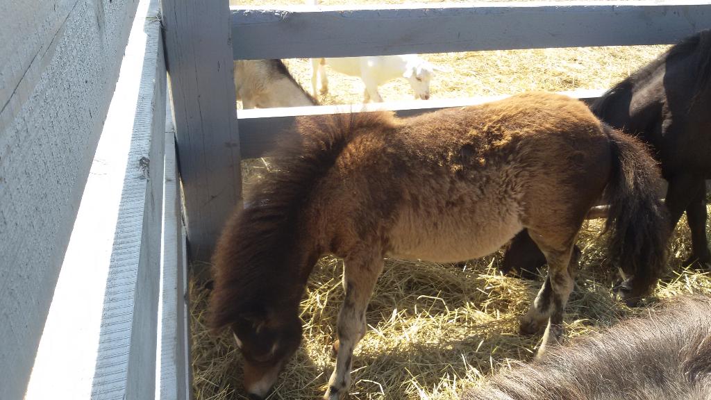 Соседствуют с козлятами шетлендские пони. По сравнению с козами их малыш уже не выглядит маленьким.
