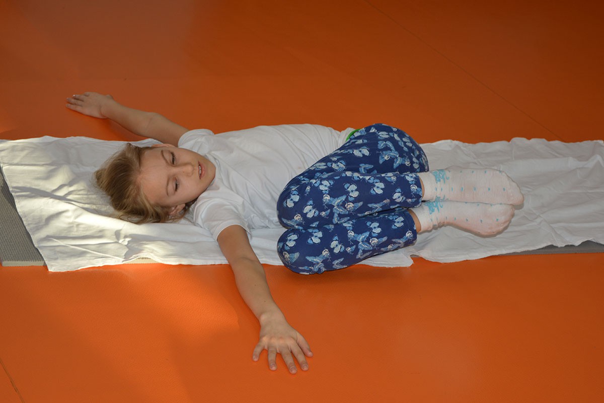 Просим ребёнка лечь на спину и потянуться руками к ногам, поднятым под углом около 45 градусов. Данное положение удерживается не менее 30 секунд.
