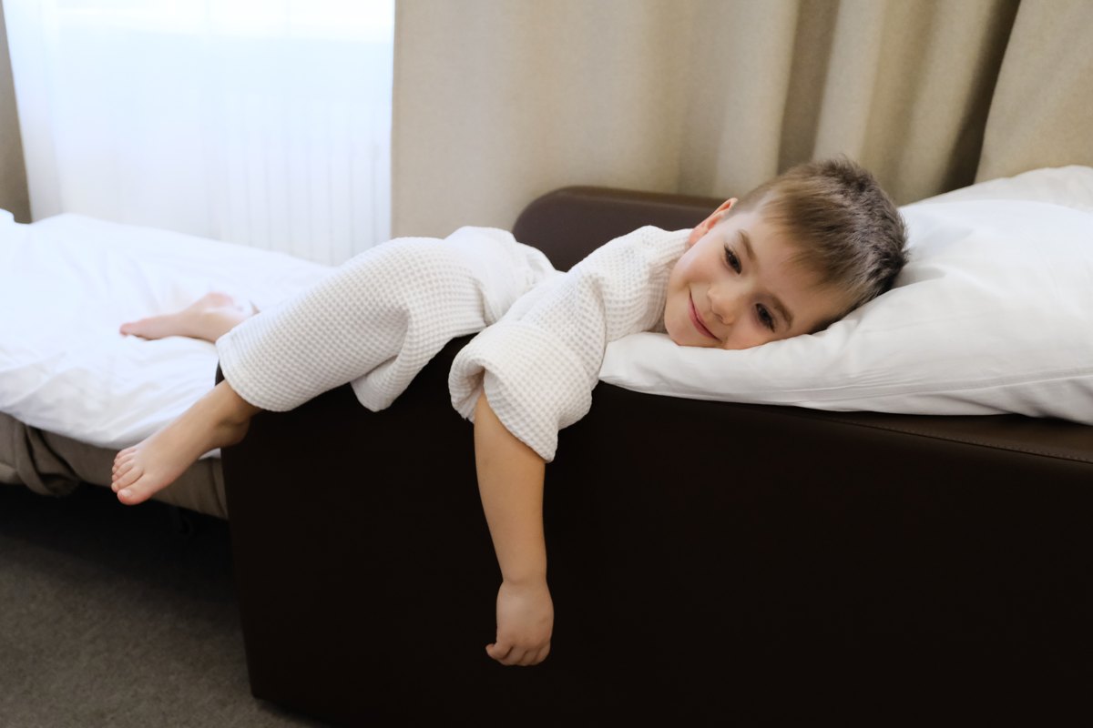 Большая площадь номера позволяет провести в нем семейный отпуск. Планировка и оснащение «Семейного престижа» учитывает эту особенность. В номере двуспальная кровать для родителей, а детям предложат дополнительные места. Одного малыша разместят на удобном кресле-кровати или еврораскладушке. Семья с двумя детьми может выбрать номер с двухъярусной кроватью. Мест хранения в номере также хватит для большой семьи: здесь есть шкафы, прикроватные тумбочки.