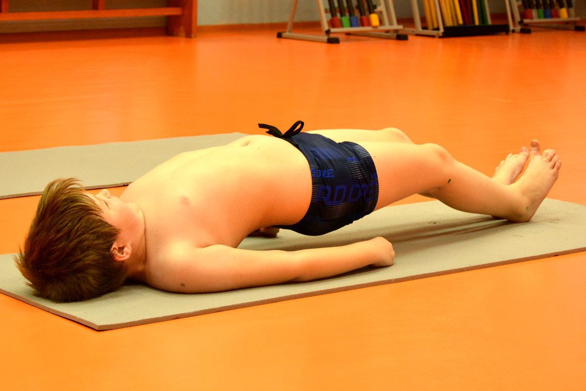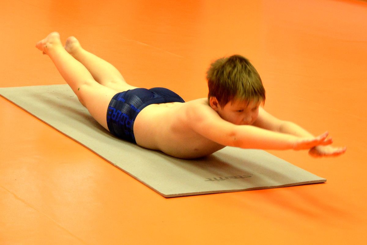 Ребёнок ложится на живот, лицом вниз, ступни параллельны полу. На вдохе поднимаем руки и ноги от пола, на выдохе отпускаем. Нужно сделать не менее 10-30 повторов.